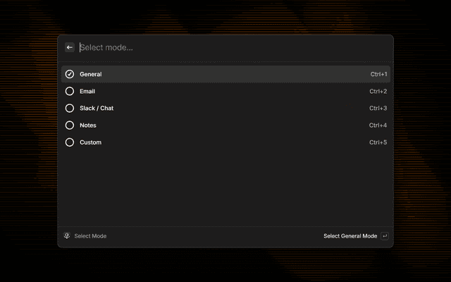 - AI cleanup modes — General, Email, Slack/Chat, Notes, or your own custom prompt