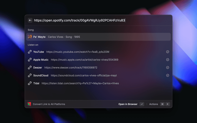• Convert Link to Spotify: Convert a link from the clipboard to Spotify and copy it back.