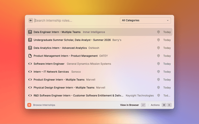 Onbo transforms the chaotic job search experience into a streamlined, keyboard-driven workflow within Raycast. Built specifically for college students and new grads entering tech, it lets you find roles and track applications without juggling tabs, spreadsheets, and bookmarks.