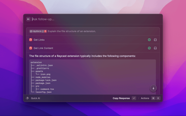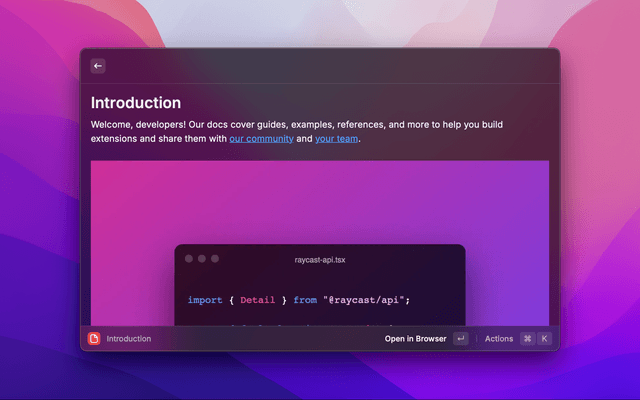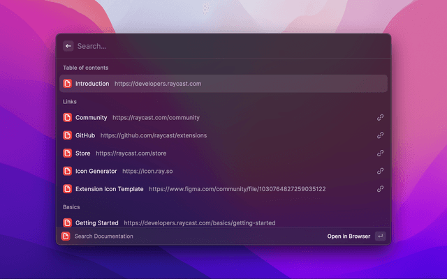 Search Raycast's documentation quickly, copy the URL, or open it in your browser