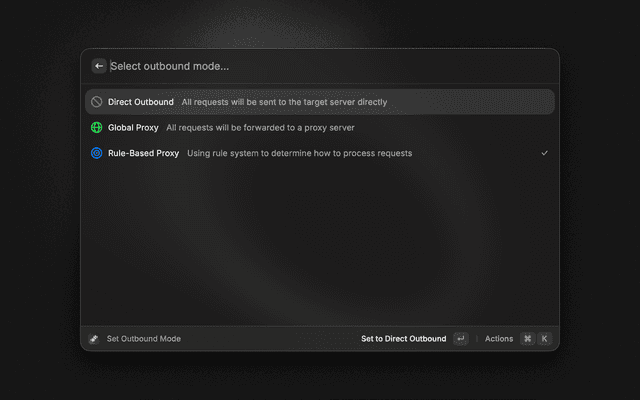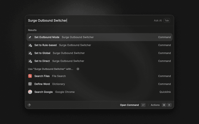 A Raycast extension for quickly switching Surge's outbound mode without using HTTP API.