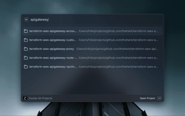 (i.e. the directories you use) are filtered to just those that are git repositories and ordered by most frequently used. From there, this extension allows you to fuzzy find a specific project, then open that project with the tool of your choice. For me, zed.