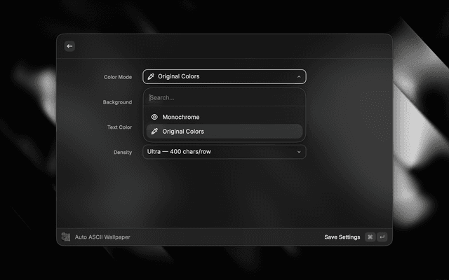 The extension fetches artwork images from the Met Museum's public API, converts them to ASCII characters using brightness mapping, and renders the result as a full-screen wallpaper image using macOS native text rendering (via sips and a compiled Swift renderer).