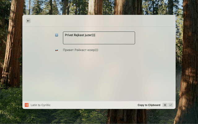Convert Latin characters to Russian Cyrillic using phonetic transliteration rules. This Raycast extension makes it easy to transliterate text on the fly, perfect for when you need to write in Russian but are using a Latin keyboard.