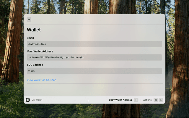 Vixai is a Raycast extension that provides a seamless UI for interacting with the vixai.tech API. It enables users to manage wallets, transfer tokens, and trade on Solana — all without needing to manually set up a Solana wallet.