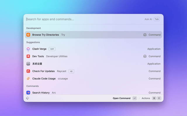 Open Raycast and search for "Browse Try Directories" to see all your experiments.