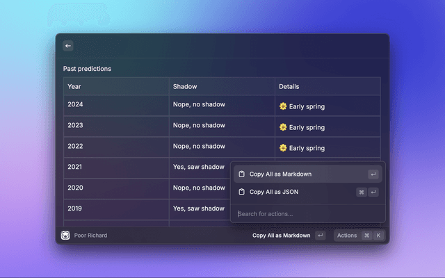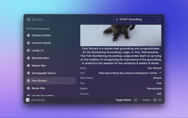 This extension uses the api at https://groundhog-day.com/ to show groundhogs and their yearly predictions.