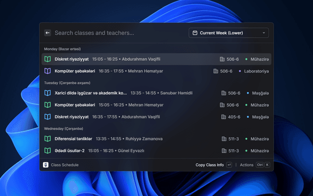 Access your Azerbaijan Technical University (AzTU) Learning Management System (LMS) data directly from Raycast. Check schedules, read announcements, and review academic records without opening a browser.