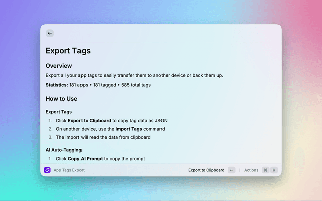 Organize and search your macOS applications with custom tags. A powerful Raycast extension that makes app discovery instant and intuitive.